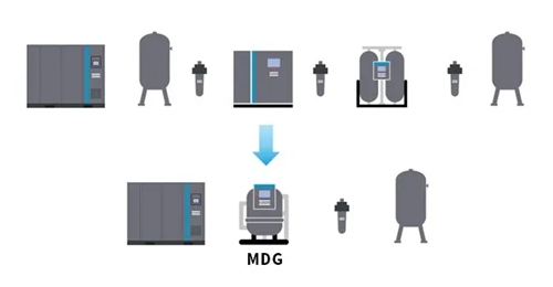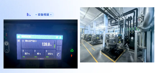 相较于电子半导体行业传统应用中,要实现稳定的-40℃ 压力露点,通常采用鼓风热零气耗机型,此次,某电子半导体巨头选择了4台MDG450,搭配无油螺杆压缩机,MDG凭借120W的“近零能耗”表现,成功助力客户构建一级能效空压站。整个项目4台机器,比传统鼓风热零气耗机型年运行电费节省超30万元,压降减少0.5bar 的系统节约用电约13万元,MDG后处理系统节省的总费用超43万元。MDG干燥后空气品质非常高,后处理系统也得以大幅度简化,无前置预冷却器,无前置湿气储罐,无前、后置过滤器,仅在末端主管网安装一支精密过滤器,占地面积显著节约。