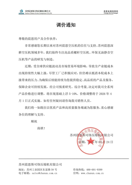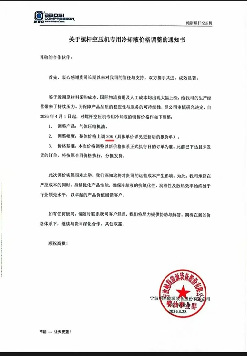 近日,阿特拉斯·科普柯、鲍斯以及鑫磊等多家知名压缩机企业相继发布通知,宣布自2026年4月1日起对部分产品价格进行调整。此次价格调整主要涉及润滑油及螺杆空压机专用冷却液等相关产品,涨幅在15%至20%不等。