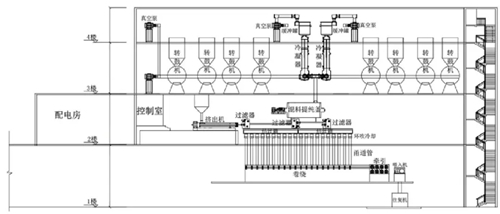 3、真空提纯工艺:真空提纯系统主要由真空泵组、冷凝器混料提纯釜、导热油加热及控制系统等组成,冷凝器与混料提纯釜之间设有两个气相阀,如图4所示。混料提纯釜夹套内的高温导热油将釜内PET原料加热至270-280℃,在负压环境下,PEI原料熔体发生均化混合、去除低分子物质,产生的有机废气经冷凝后排出,达到提纯增粘效果。