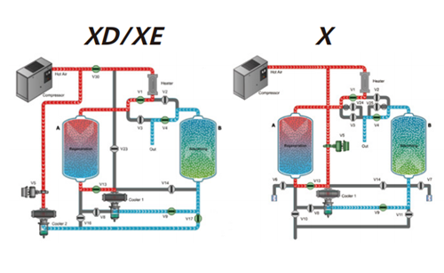 阿特拉斯·科普柯XD/X系列双塔压缩热干燥机,采用全球独创的热回收系统,直接利用空压机余热实现干燥剂再生。相比传统双塔干燥机节能超40%,且实现真正零压缩空气消耗(冷却过程零气耗),为电子、医药、化工等行业提供露点低至-70℃的稳定干燥空气。